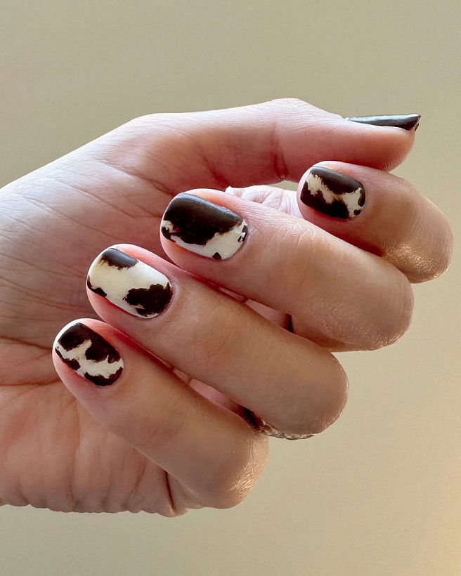 Animální vzory vévodí aktuálním trendům. Zdá se vám cute stračena být nedostižně složitý nail art design? Omyl! Nejdříve naneste dvě vrstvy bílého laku, a jakmile zaschne, namalujte přes něj flíčky. Použijte dva odstíny hnědého laku, tmavší a světlejší. Až budou i hnědé skvrny suché, aplikujte přes ně top coat a pastva pro oči je hotová. Potřebujete-li postup vidět, na IG @betina_goldstein najdete celý videotutorial