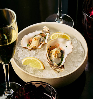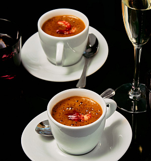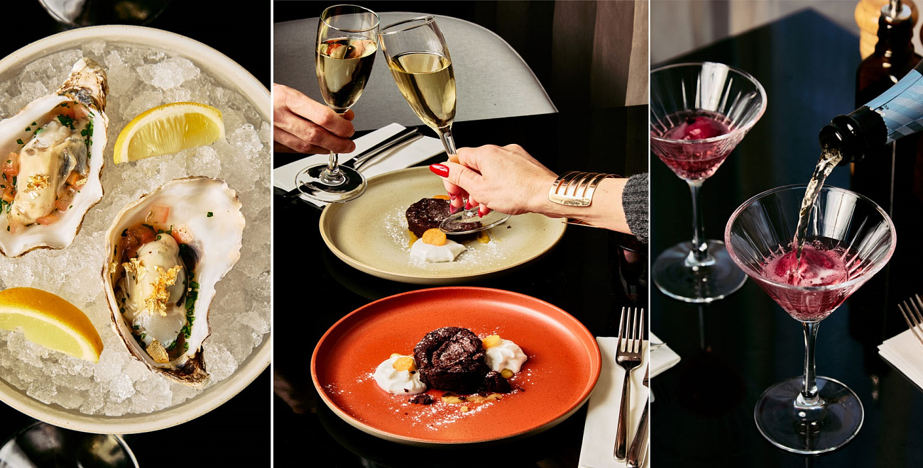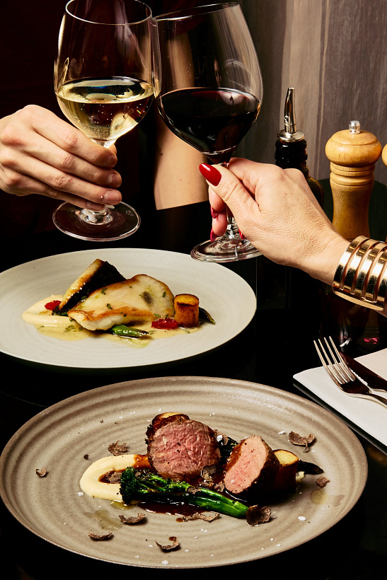 Jako amuse bouche jsou na menu ústřice, teplý předkrm zastoupí raččí capuccino, na které plynule navážou ravioli plněné konfitovaným kachním stehýnkem, kachní demi a kachní espuma. Vybírat můžete ze dvou hlavních chodů, a to buď hovězí steak ze svíčkové s pastiňákovým pyré, grilovanou brokolicí, čerstvím lanýžem a konfitovanými brambory nebo filátka kambaly s pastiňákovým pyré, grilovanou brokolicí a estragonovým beurre blanc