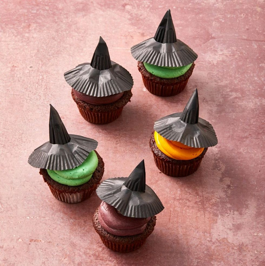 Snad každá rodina má svůj osvědčený recept na piškotové cupcaky nebo muffiny. Pro tento strašidelný svátek krém obarvěte potravinářským barvivem – černým, oranžovým, zeleným nebo červeným. Na vrch pak posaďte papírový čarodějnický klobouk, koupíte je v papírnictví nebo cukrářských potřebách.