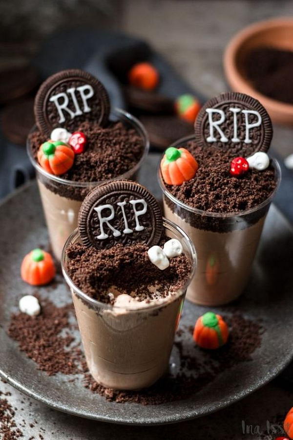 Předejte ostatním hostům vzkaz ze záhrobí – vaším milovaným Tiramisu! Připravte ho jako obvykle: vyšlehejte 250 ml šlehačky s 500 g mascarpone a vrstvěte je na cukrářské piškoty namočené v černé kávě smíchané kapkou rumu. Namísto do velké mísy nandejte Tiramisu do menších mističek a pěkně je nazdobte. Jako náhrobky můžete využít Oreo nebo Lotus sušenky, na které párátkem a polevou napište slova RIP, dýně vytvarujte z marcipánu, nezapomeňte na gumové hady nebo z bílků vyšlehejte sněhové duchy (tip: aby sníh držel tvar, šlehejte bílky ve vodní lázni).
